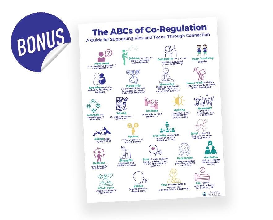 This illustrated guide helps kids and caregivers build co-regulation habits from A to Z. Whether it’s deep breathing or gentle movement, each letter introduces a simple yet powerful practice to support emotional balance—together.